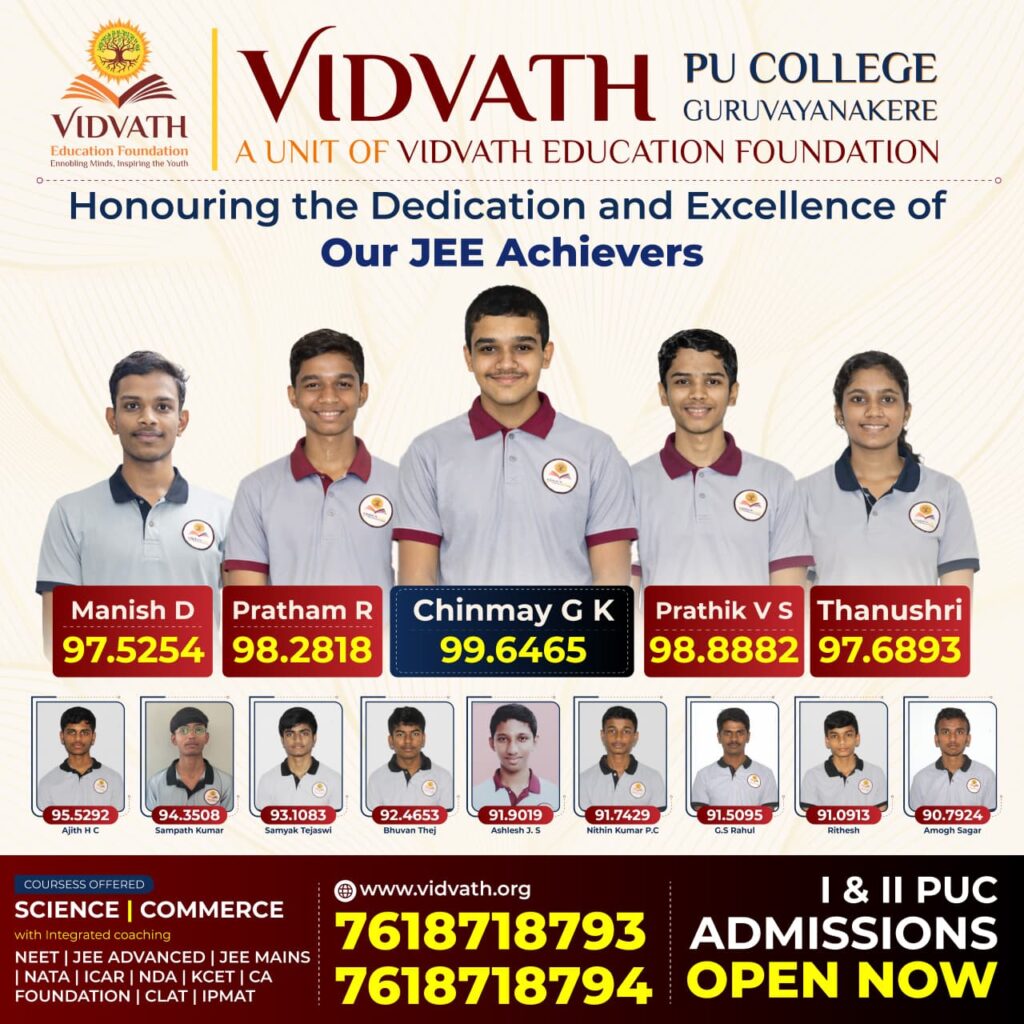 In a remarkable academic milestone, Vidvath PU College, Guruvayanakere has made an impressive mark in the highly competitive JEE Main examination. Demonstrating excellence right from its inception, the institution has achieved outstanding results with its very first batch of students.