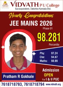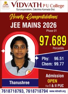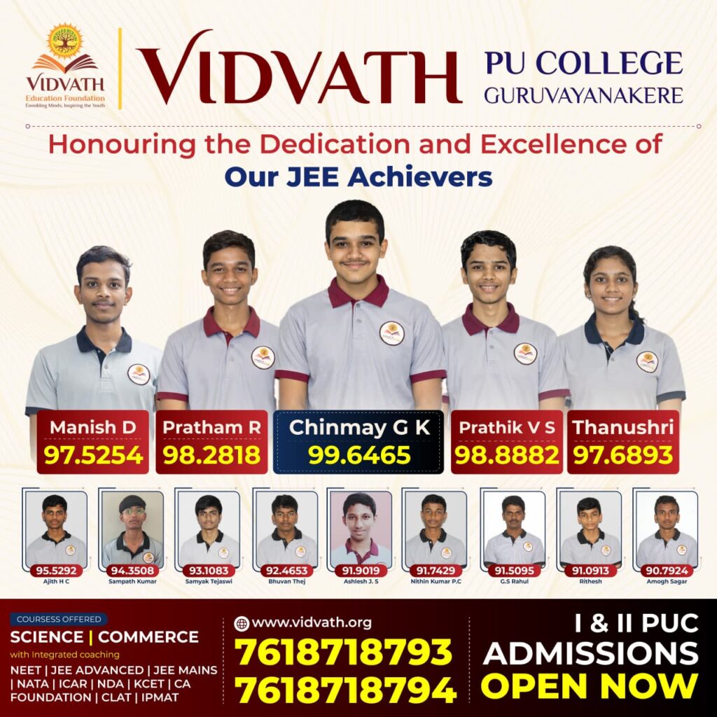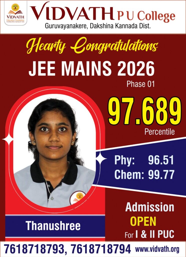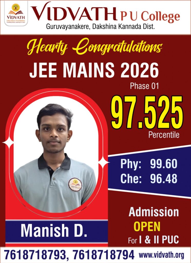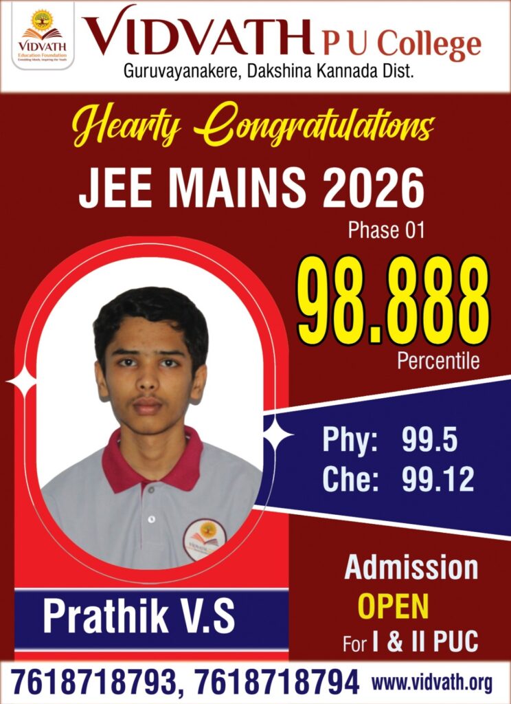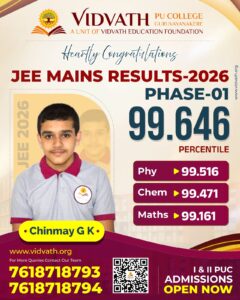 ಬೆಳ್ತಂಗಡಿ: ಭಾರತೀಯ ಪ್ರತಿಷ್ಠಿತ ಸಂಸ್ಥೆಗಳಾದ ಎನ್ಐಟಿ ಹಾಗೂ ಐಐಐಟಿ ಪ್ರವೇಶಕ್ಕೆ ಅವಕಾಶ ಕಲ್ಪಿಸುವ ಜೆಇಇ (ಮೇನ್ಸ್)- 2026 ಪರೀಕ್ಷೆಯಲ್ಲಿ ಗುರುವಾಯನಕೆರೆ ವಿದ್ವತ್ ಪಿಯು ಕಾಲೇಜಿನ ವಿದ್ಯಾರ್ಥಿ ಚಿನ್ಮಯ್ ಜಿ.ಕೆ. ಶೇ.99.6465 ಪರ್ಸೆಂಟೈಲ್ ಪಡೆಯುವ ಮೂಲಕ ದ.ಕ.ಜಿಲ್ಲೆಗೆ ಹಾಗೂ ಬೆಳ್ತಂಗಡಿ ತಾಲೂಕಿಗೆ ಅದ್ವಿತೀಯ ಸಾಧನೆ ತೋರಿದ್ದಾರೆ.